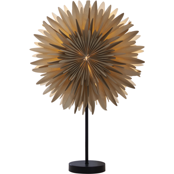 Fantastisk beige pappersstjärna med guld prickar och svart fot . Stjärnan är tillverkad av tre lager veckat papper. Konturen har runda flikar som gör att stjärnan ser busigt vintrig ut. Adventsstjärnan på fot skapar en perfekt julstämning och ger hemmet den där speciella julkänslan. Kan placeras både i fönster och på en skänk.
